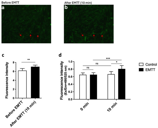 EMTT increases the intracellular calcium concentration in hOBs. The hOBs were incubated at 37 °C for 45 min with Calbryte 520 AM containing buffer in the presence of 2.5 mM probenecid. (a,b) Cells were stimulated with EMTT for 10 min, and the images were taken before (a) and after (b) stimulation with a fluorescence microscope using the FITC channel. Two representative images are illustrated. Red arrows show calcium increase in the cells. (c) The cellular fluorescence images were quantitated using ImageJ software. (d) Fluorescence was measured using a fluorescence plate reader (Ex: 485/Em: 538). Data are expressed as the average ± SD of five independent experiments (n = 5). ns: non-significant. * p < 0.05, ** p < 0.01, and *** p < 0.001, paired Student’s t-test and two-tailed Student’s t-test.