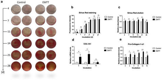 EMTT stimulation enhanced collagen synthesis in human osteoblasts (hOBs). (a) Sirius Red staining. Two representative wells are illustrated. (b) The images were quantitated using ImageJ software. (c) The Sirius Red dye was eluted using 0.1 N Sodium Hydroxide (NaOH), and the absorbance was measured at 570 nm. Results are presented relative to the control (normalized to 1). (d) Data analysis was performed by using the 2−ΔΔCT method. Gene expression was normalized to GAPDH and compared by setting control cultures to 1 as a reference value. Cells were stimulated with EMTT according to our stimulation protocol (Figure 1b), followed by RNA extraction and PCR. (e) Pro-Collagen-1-α1 protein levels were determined using ELISA according to the manufacturer’s instructions. Supernatants were collected at different time points: day 0 (pre-first EMTT stimulation), 4, 7, 11, 14, and 16. Results are presented relative to the control (normalized to 1). Data are expressed as the average ± SD of three to six independent experiments (n = 3–6). ns: non-significant. * p < 0.05, ** p < 0.01, and *** p < 0.001, two-tailed Student’s t-test.