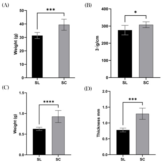 The SC mice demonstrated a significant increase in total body weight compared to their SL counterparts, with a mean weight of 39.4 g and 31.4 g, respectively (p = 0.0003; 95% CI 4.466–11.61), Figure 3A. When calculating the LI, the results remained significant, with the SC group demonstrating a greater body mass index compare to the SL group. For example, the mean SL was 276.3 ∛g/cm and SC was 307.7 ∛g/cm (p = 0.0163; 95% CI 6.732–56.07), Figure 3B.