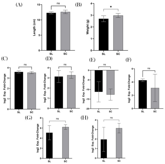 Statistical Analysis: All animals were included in the analysis. GraphPad Prism (Version 9.4.1 for Windows, Dotmatics, Massachusetts, USA) was used. Statistical significance was accepted as p < 0.05. Independent-samples t-test was employed to determine the statistical difference between the two groups. There were no outliers in the data, as assessed by an inspection of boxplots. All results were normally distributed, as assessed by Shapiro–Wilk’s test. Data are presented as mean ± standard deviation, against the “standard laboratory” group. For RT-qPCR results, the data are transformed logarithmically for statistical analysis and are presented as an expression fold-change to the log2.