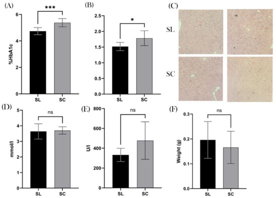 We found a significant difference in the % of HbA1C between the two groups, with a mean SL value of 4.74% and SC of 5.38% (p = 0.0006; 95% CI 0.3270–0.9480), Figure 5A. Furthermore, there was a significant difference in the average hepatic weight, with the SL group being 1.5 g and the SC group 1.8 g (p = 0.0151; 95% CI 0.05998–0.4725), Figure 5B. Interestingly, when inspecting the hepatic histology, none of the samples demonstrated non-alcoholic fatty liver disease (NAFLD) or indeed any other pathology, Figure 5C, thus questioning the clinical relevance of this difference. We found no significant difference in serum total cholesterol or ALT levels (p = 0.8580 and p = 0.2799), Figure 5D,E. We also found no difference in splenic weight (p = 0.5152), Figure 5F.