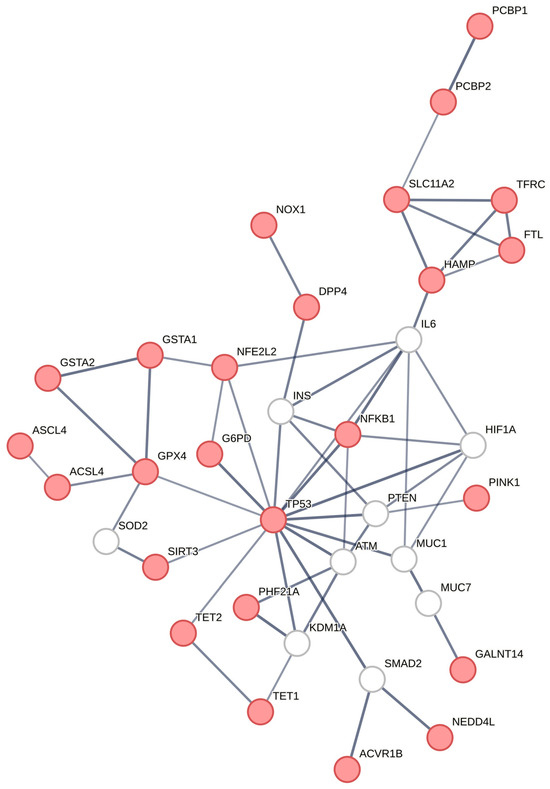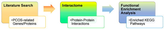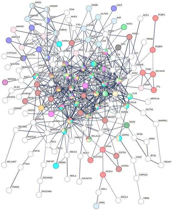 PCOS-related and FPT–PCOS-associated genes/proteins were retrieved through an extensive literature search of the bibliographic database PubMed/MEDLINE up to the current date. Given that the proteins implicated in the same disease tend to interact, either physically or functionally, with each other [11], the interactions among these gene products were investigated through STRING v12.0 [12], a database of both known and predicted associations among genes/proteins. A high confidence interaction score of above 0.7 was chosen. To avoid false positives (i.e., erroneous associations), only those interactions derived from experiments, text mining of published studies, and curated knowledge bases of protein complexes and pathways were included. Moreover, genes/gene products not previously reported to be associated with PCOS or FPT–PCOS, and therefore not included in the initial set of molecules in STRING, are referred to as “novel” throughout the manuscript; the latter were identified through iterative searches for the minimum number of nodes interacting with the existing nodes.
