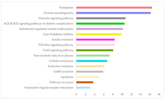 The over-represented KEGG pathways in the PCOS-relevant genes are described in Table 4; the major hubs of the herein presented updated interactome are underlined. Accordingly, in Figure 3, the enrichment analysis results of KEGG pathways are illustrated. The color code adopted in Figure 3 is similar to the one adopted in the pathway highlighted in Figure 2.