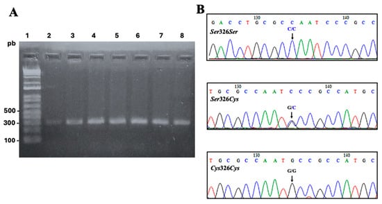 OGG1 Ser326Cys polymorphism detection. (A) Agarose (2%) gel electrophoresis of amplicons from representative samples. Lane 1: DNA ladder 100 pb. Lanes 2–8: 300 pb amplicons of OGG1 obtained from representative samples. (B) Representative electropherograms showing the sequence of OGG1 amplicons with genotypes detected.