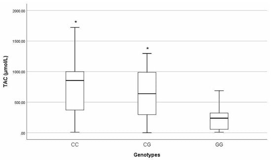 Total antioxidant capacity (TAC) levels by genotype. Data are expressed as median and compared using Kruskal–Wallis test. * Genotype GG vs. other genotype groups shows significant difference. Significant difference is defined as p ≤ 0.05 and a large effect size (η2p = 0.102).