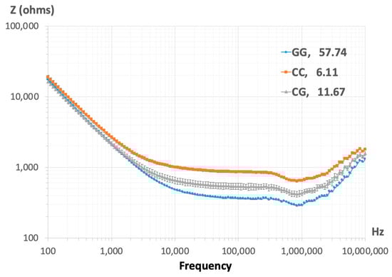 The EBiS of the representative DNA samples with Ser326Ser (CC), Ser326Cys (CG), and Cys326Cys (GG) genotypes was plotted in magnitude and their spectra displayed. EBiS measurements are expressed as the mean value of three assays with the corresponding standard error. Differences in electrical properties were detected between genotypes (Figure 4). The patient with the Cys326Cys (GG) genotype showed lower impedance compared to the other genotypes.