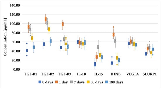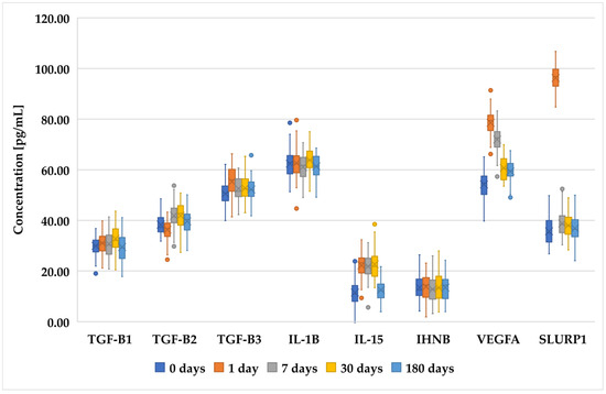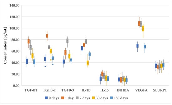 Changes in concentration profiles of analyzed proteins over a 180-day observation period in patients who underwent SMILE procedure. TGF-β1–3, transforming growth factor beta 1–3; IL-1β, interleukin-1 beta; IL-15, interleukin-15; IHNBA, inhibin beta A chain; VEGFA, vascular endothelial growth factor A; SLURP1, secreted Ly-6_uPAR-related protein 1.