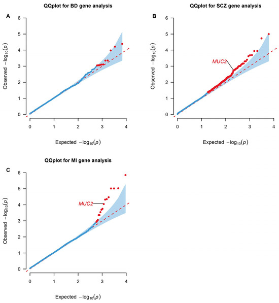 QQ plots for gene-level association tests in WES analyses. Genes enriched in RVtests analyses of the BD (A), SCZ (B), and MI (C) significant rare architecture are shown in the plots. The dots colored red represent statistically significant genes based on a Benjamini–Hochberg correction for multiple testing at FDR < 0.25 and p value < 0.05. BD: Bipolar Disorder; SCZ: Schizophrenia; MI: Myocardial Infarction. The data are available in Supplementary Tables S10–S12.
