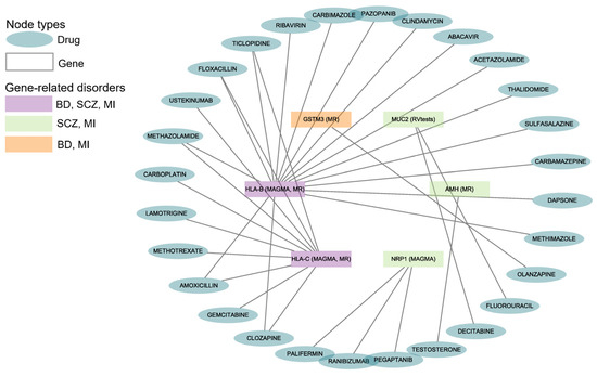 The drug–gene interaction results from DGIdb indicated that 28 drugs or compounds interacted with the six shared genes of BD, SCZ, and MI (Figure 3). Multiple drugs can target the same gene for their effects (such as 16 drugs targeting HLA-B, 10 drugs targeting HLA-C, and 3 drugs targeting NRP1).