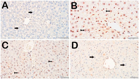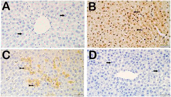 To perform the IHC technique, thin sections measuring 1–2 μm were extracted from paraffin blocks of liver tissue and mounted on slides with a positive charge. The removal of paraffin was then carried out. The liver tissue slices were analyzed via immunohistochemistry labeling with primary antibodies against CHOP (E-AB-70087, 1/300, Elabscience, Houston, TX, USA), GPR78 (SC-13539, 1/350, Santa Cruz Biotechnology Inc. Dallas, TX, USA), 8-hydroxy-2′-deoxyguanosine (8-OHdG) (Santa Cruz, SC-66036, 1/200, Santa Cruz Biotechnology Inc., Dallas, TX, USA), cleaved caspase-3 (Abcam, ab4051, 1/100), anti-Bax ab32503, 1/200, (Abcam, Cambridge, UK), and anti-Bcl-2 (Abcam, ab32124, 1/200). After exposure to primary antibodies, the liver tissues were subsequently incubated with a secondary antibody (goat anti-rabbit IgG H&L HRP, ab205719; Abcam, Cambridge, UK). The image signal was acquired via a light microscope by applying a diaminobenzidine chromogen (Ultraview, Leica Biosystems, Nussloch, Germany) to the tissues. The sample was counterstained with Harris hematoxylin and then protected with a suitable sealing solution.