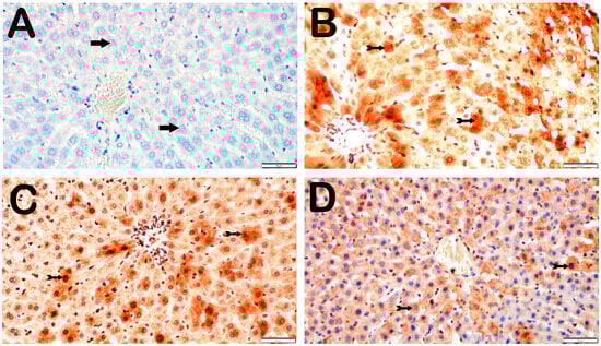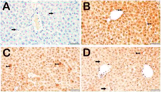 Two histopathologists who were unaware of the study groups assessed the number of positively stained cells in liver tissue sections exposed to primary antibodies against Caspase-3, Bax, Bcl-2,8-OHdG, CHOP, and GRP-78. Semiquantitative analysis of liver IHC staining was performed by evaluating immunopositivity in hepatocytes as absent = 0 (≤5%), mild = 1 (≤25%), moderate = 2 (≤50%), and severe = 3 (≤75%), (Supplementary Table S2). The positive IHC score was determined by randomly selecting 25 distinct regions from each of the five separate preparations of rats [].