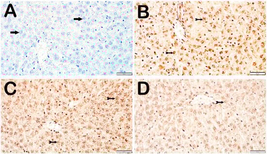 To measure the levels of malondialdehyde (TBARS, MDA) in the tissue, a 200 μL liver tissue sample was combined with 50 μL of sodium dodecyl sulfate (8.1%, w/v), 375 μL of thiobarbituric acid (0.8%, w/v), and 375 μL of acetic acid (20%, v/v). The mixture was then placed in a boiling water bath for 1 h. Next, the samples were centrifuged at 750× g for 10 min. A spectrophotometric measurement was subsequently taken at a wavelength of 532 nm. The results were quantified in millimoles per liter (mmol/L) [].