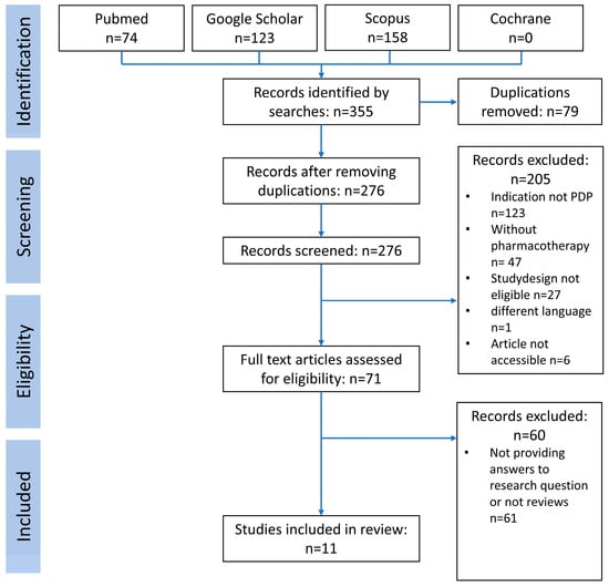 The search in the four databases led to 355 publications. After removing 79 duplications, the remaining 276 publication abstracts were assessed for inclusion. Another 205 studies did not meet the inclusion criteria. A text analysis of the remaining 71 studies yielded eleven studies, which were assessed for quality by the AMSTAR 2 tool. Another 60 studies were excluded at this step due to very low quality, not focusing on PDP or pharmacotherapy, or not being a review. The process is displayed in the PRISMA flow chart (Figure 2).