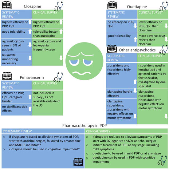 In summary, the results from the two phases indicate that this review of reviews identified efficacy solely for clozapine and pimavanserin, whereas clinicians continued to prescribe quetiapine despite its lower estimated efficacy and the higher incidence of adverse events compared to clozapine. The overwhelming majority of the clinical specialists expressed willingness to utilize antipsychotics at any stage of PDP. The German guideline on PD relies on the review by Yunusa et al. as the most recent source of evidence [38,47]. It recommends the use of clozapine and alludes to the controversial use of quetiapine, which results from the problem of potentially occurring agranulocytosis caused by clozapine and a lack of better alternatives.