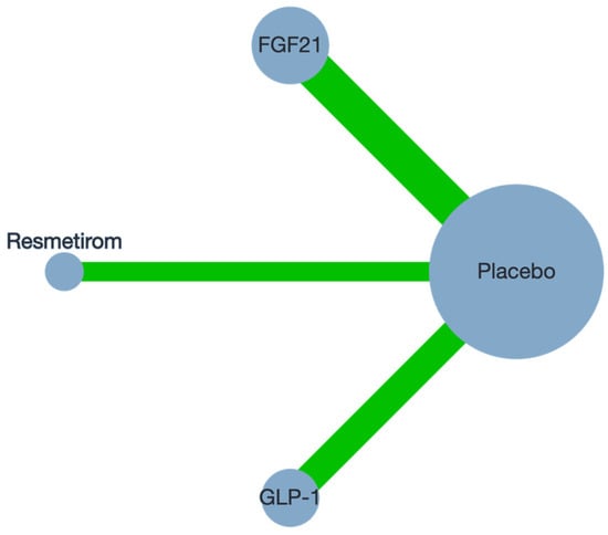 Network plot of treatment comparisons for NASH resolution. This network plot shows the direct comparisons among Resmetirom, FGF21, GLP-1, and placebo in studies for NASH resolution. Node size reflects the number of studies involving each treatment, while edge thickness indicates the number of direct comparisons between treatments.