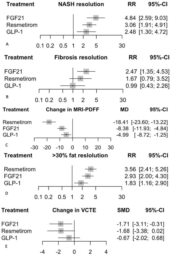Results of biopsy and imaging outcomes. This figure presents a series of forest plots comparing the efficacy of FGF21, Resmetirom, and GLP-1 treatments against placebo in patients with MASH/MASLD. The outcomes measured are: (A) NASH resolution: The relative risk (RR) with 95% confidence intervals (CI) shows the likelihood of NASH resolution for each treatment compared to placebo. (B) Improvement in fibrosis: The RR with 95% CI indicates the likelihood of fibrosis resolution for each treatment compared to placebo. (C) Change in MRI-PDFF: The mean difference (MD) with 95% CI represents the change in MRI-estimated proton density fat fraction (MRI-PDFF) for each treatment compared to placebo. (D) >30% fat resolution: The RR with 95% CI shows the likelihood of achieving more than 30% fat resolution for each treatment compared to placebo. (E) Change in VCTE: The standardized mean difference (SMD) with 95% CI indicates the change in vibration-controlled transient elastography (VCTE) scores for each treatment compared to placebo. Grey squares represent effect estimates; horizontal lines show 95% CIs.
