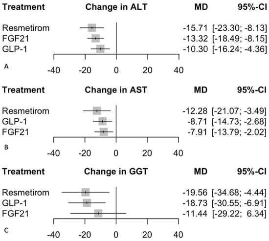 Changes in liver enzymes. This figure presents a series of forest plots comparing the efficacy of FGF21, Resmetirom, and GLP-1 treatments against placebo in patients with MASH/MASLD. The outcomes measured are (A) Change in ALT: The mean difference (MD) with 95% confidence intervals (CI) shows the change in alanine aminotransferase (ALT) levels for each treatment compared to placebo. (B) Change in AST: The MD with 95% CI indicates the change in aspartate aminotransferase (AST) levels for each treatment compared to placebo. (C) Change in GGT: The MD with 95% CI represents the change in gamma-glutamyl transferase (GGT) levels for each treatment compared to placebo. Grey squares represent effect estimates; horizontal lines show 95% CIs.