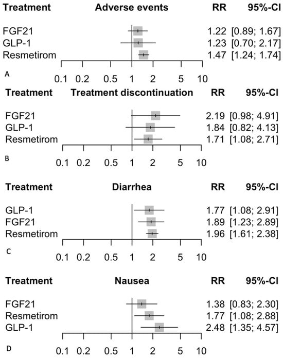Safety outcomes. This figure presents a series of forest plots comparing the safety of FGF21, GLP-1, and Resmetirom treatments against placebo in MASH/MASLD. The outcomes measured are (A) Adverse events: The relative risk (RR) with 95% confidence intervals (CI) shows the likelihood of experiencing adverse events for each treatment compared to placebo. (B) Treatment discontinuation: The RR with 95% CI indicates the likelihood of treatment discontinuation for each treatment compared to placebo. (C) Diarrhea: The RR with 95% CI represents the likelihood of experiencing diarrhea for each treatment compared to placebo. (D) Nausea: The RR with 95% CI shows the likelihood of experiencing nausea for each treatment compared to placebo. Grey squares represent effect estimates; horizontal lines show 95% CIs.