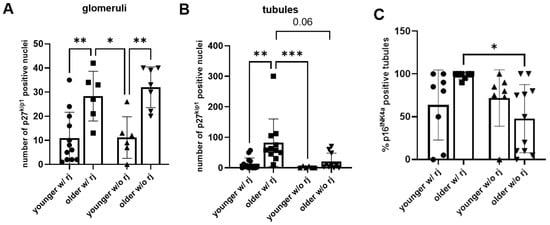 The number of p27kip1-positive glomeruli was higher in the older patients w/rj compared to the younger patients w/rj (Figure 1A). The same pattern was observed in the patients w/o rj (Figure 1A). The number of p27kip1-positive tubules was higher in the older patients w/rj compared to the younger patients w/rj (Figure 1B) and compared to both the older and younger patients w/o rj; however, in the case of the older patients w/o rj, the result was on the border of statistical significance (p = 0.06, Figure 1B), while no difference was found between the older and younger patients in the group w/o rj (Figure 1B).