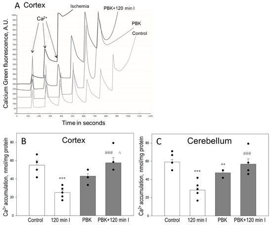 We aimed to investigate whether the application of pentobarbital/ketamine (PBK) can increase the capability of cortex and cerebellum mitochondria to retain calcium during ischemia. Isolated mitochondria of all groups were energized with succinate and then were treated with pulses of Ca2+ (1.67 µM) until the opening of the mPTP (representation of the curves shown in the Figure 1A). The assay used measures the sensitivity of mitochondria to Ca2+, which is referred to as Ca2+ retention capacity (CRC). The quantitative analysis of results showed that control mitochondria of the brain cortex were capable to accumulate Ca2+ to a level of 55 ± 5 nmol/mg protein (Figure 1B). One hundred and twenty minutes of ischemia markedly reduced the CRC of cortex mitochondria to 32 ± 1 nmol/mg protein. PBK control of cortex mitochondria showed similar CRC as control, 45 ± 3 nmol/mg protein. However, the CRC of cortex mitochondria isolated after PBK anesthesia and 120 min ischemia was similar to that of the control and slightly higher than in the PBK control group: 57 ± 6 nmol/mg protein (Figure 1B). Similar results were obtained with cerebellum mitochondria (Figure 1C): mitochondria of the control group were able to accumulate 59 ± 3 nmol/mg protein of Ca2+; 120 min ischemia reduced it to 36 ± 3 nmol/mg protein; CRC of the PBK control group was 47 ± 3 nmol/mg protein; and of the PBK + 120 min group was 57 ± 6 nmol/mg protein. These results indicate that anesthesia with PBK desensitizes ischemia-damaged cortical and cerebellar mitochondria to Ca2+ and initiation of mPTP opening. However, there were no differences in CRC of mitochondria isolated from the cortex and cerebellum under control and ischemic conditions plus/minus PBK anesthesia.