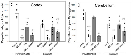 Next, we measured the respiration rate of control and ischemia-damaged mitochondria isolated from rat brain cortex and cerebellum with/without PBK respiring with pyruvate/malate and succinate. As shown in Figure 2, ischemia significantly decreased VADP of isolated cortex mitochondria with pyruvate/malate and succinate (by 85% and 78%, respectively) compared to control (Figure 2A,C). Cortical mitochondria of the PBK control group exhibited partially inhibited VADP respiration with pyruvate/malate (by 48%) compared to the control, while with succinate the respiration rate was as high as in the control group (Figure 2A–C). The VADP of cortical mitochondria isolated after PBK and 120 min ischemia was significantly higher (nearly two and a half times) oxidizing succinate, though not fully recovered, and by 65% higher oxidizing pyruvate/malate compared to the corresponding 120 min ischemic group (Figure 2C).