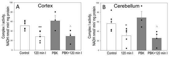 Next, we tested whether PBK can inhibit complex I activity in control and ischemia-damaged isolated, frozen–thawed/sonicated cortical and cerebellar mitochondria, measured as the NADH oxidation in the presence of coenzyme Q1. As expected, 120 min ischemia decreased complex I activity by 45% in isolated cortex (Figure 3A) and cerebellum (Figure 3B) mitochondria, compared with the respective control. PBK anesthesia itself did not change the activity of complex I in either cortex or cerebellum mitochondria or control groups and was as high as in the control groups, indicating that the effects of anesthesia might be rapidly reversible. However, PBK ± 120 min ischemia resulted the loss of complex I activity at a similar level to that in 120 min I group: by 45% in cortex mitochondria (Figure 3A) and by 55% in cerebellum mitochondria (Figure 3B). The results indicate that 120 min of ischemia leads to a significant decrease in the activity of complex I in both the cortex and cerebellum, which was not modified by PBK.