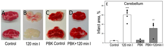 Effect of PBK on TTC staining during brain ischemia in cerebellum slices. Representative images of TTC-stained cerebellum slices: (A) Control; (B) after 120 min ischemia; (C) PBK control; (D) PBK anesthesia + 120 min ischemia (E) quantitative analysis of infarct area in each group. Experimental conditions were the same as described in Figure 4. ***—statistically significant effect, if compared to control, p < 0.001, ##—statistically significant effect, if compared to 120 min ischemia group, p < 0.01. Means ± SE of 3–6 separate experiments are presented.