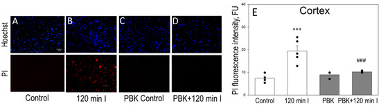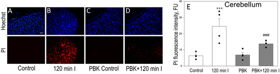 Alongside, Figure 7A–D represents images of cerebellum Hoechst (upper images) and PI (bottom) fluorescence of the same microscopic field and Figure 7E represents PI (red) fluorescence intensity units, which in control were 6.72 after 120 min of ischemia—24.55; PBK + 120 min ischemia—13.34; PBK control was only 6.08 PI FU.