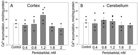 Direct effect of pentobarbital on Ca2+ retention capacity of isolated brain cortex and cerebellum mitochondria. Mitochondrial CRC was measured in isolated normal rat brain cortex (A) and cerebellum (B) mitochondria fluorometrically using succinate as a substrate, as described in Materials and Methods. Mitochondria were incubated for 2 min in the absence/presence of sodium pentobarbital at various concentrations (0.4–2 mM); then, pulses of Ca2+ (1.67 µM) were added until opening of mPTP. *—statistically significant effect, if compared to control, p < 0.05. Means ± SE of 6 separate experiments are presented.