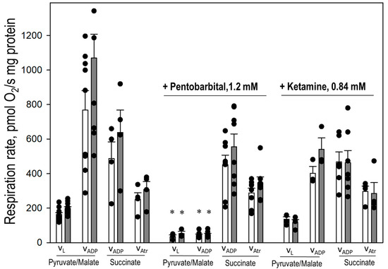 Next, we measured direct effect of sodium pentobarbital and ketamine on respiration in isolated cortex and cerebellum mitochondria (Figure 9). Mitochondria were incubated for 2 min in the presence of 1.2 mM of pentobarbital or 0.84 mM of ketamine, as well as the initial respiration rate (VL) and ADP-stimulated respiration rate (VADP) with substrates pyruvate and malate; then, ADP-stimulated respiration rate and atractyloside-inhibited respiration (VAtr) with succinate were measured. As shown in Figure 9, 1.2 mM of pentobarbital added to suspension of isolated mitochondria induced inhibition of VL and VADP in both cortex and cerebellum mitochondria, oxidizing pyruvate/malate: VL was decreased from 162 and 193 to 26 and 40 pmol/O2/mg protein, in cortex and cerebellum, respectively; VADP was inhibited from 754 and 1055 to 43 and 45 pmol/O2/mg protein in cortex and cerebellum mitochondria, respectively. In contrast, VADP and VAtr of mitochondria respiring with succinate of in the presence of sodium pentobarbital was not affected in either cortex or cerebellum mitochondria (Figure 9). The results indicate that sodium pentobarbital induces inhibition of VL and VADP respiration in isolated brain cortex and cerebellum mitochondria respiring on complex I substrates pyruvate and malate, while oxidation of complex II substrate succinate was not affected. In addition, ketamine at concentration 0.84 mM did not significantly change VL and ADP-stimulated respiration with substrates pyruvate/malate and succinate in isolated cortex and cerebellum mitochondria (Figure 9).