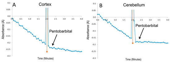 Finally, we determined the direct effect of pentobarbital on complex I activity in cortical and cerebellar mitochondria disrupted by freeze–thaw/sonication. Pentobarbital (8 mM) strongly inhibited complex I activity by 84% in cortex and by 91% in cerebellum mitochondria, compared to complex I activity of non-treated control mitochondria (Figure 10A,B).