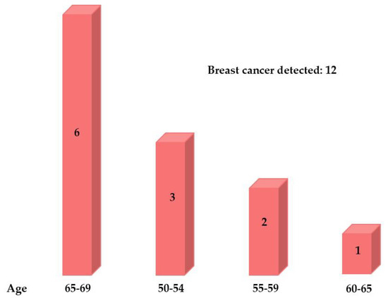 The largest number of BC cases, six (50%), to be exact, were detected in the oldest 65–69 age group, accounting for one-half of the total detected BC cases (Figure 2).