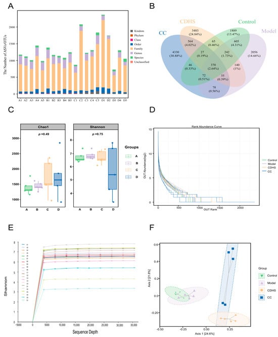 Results of species diversity across the four groups. (A) The count of OTUs in the four groups. (B) Venn diagram displaying the shared and unique OTUs among the groups. (C) Analysis of alpha diversity. (D) Rarefaction curve illustrating sequencing depth. (E) Abundance curve showing species richness. (F) PCoA plot representing beta diversity. Group A refers to the Control group, B to the Model group, C to the CDHS group, and D to the CC group.