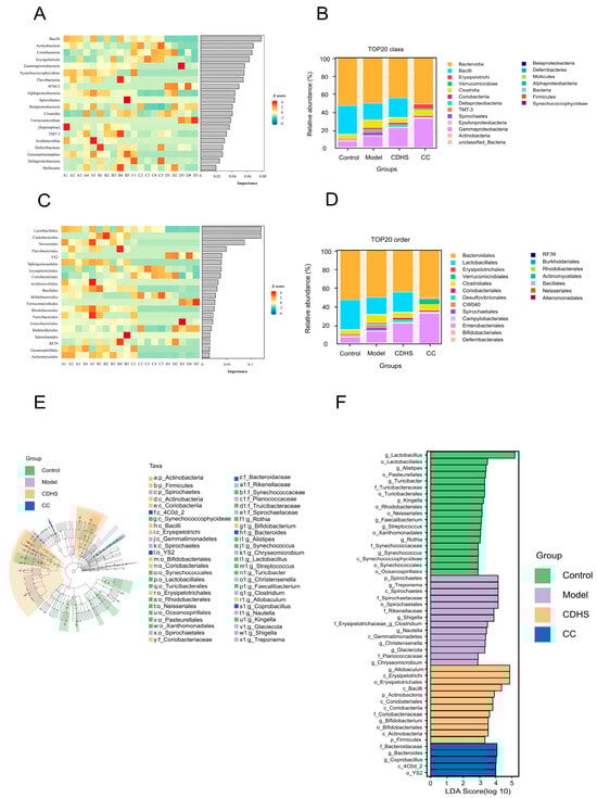 Random forest analysis (RFA) was performed, along with a cumulative abundance assessment of the top 20 species within each group. At the class level, the CC group exhibited a higher relative abundance of c_Gammaproteobacteria compared to the other groups (Figure 6A,B). Likewise, at the order level, the CC group showed a significant increase in the relative abundance of Enterobacteriales (Figure 6C,D). The Linear Discriminant Analysis (LDA) effect size threshold was set at 4, with a p-value of 0.05 after adjusting for false discovery rate, to identify statistically significant microbial markers across the four groups. In the CC group, five microorganisms exhibited significant differences, ranked by LDA score from lowest to highest: o_YS2, c_4C0d_2, g_Coprobacillus, g_Bacteroides, and f_Bacteroidaceae. In the CDHS group, twelve distinct microorganisms were identified, ranked in ascending order by LDA score: p_Firmicutes, c_Actinobacteria, o_Bifidobacteriales, g_Bifidobacterium, f_Coriobacteriaceae, c_Coriobacteriia, c_Coriobateriales, p_Actinobacteria, c_Bacilli, o_Erysipelotrichales, c_Erysipelotrichi, and g_Allobaculum. In the Model group, fourteen microorganisms showed significant differences, listed by LDA score from lowest to highest: g_Chryseomicrobium, f_Planococcaceae, g_Glaciecola, g_Christensenella, c_Gemmatimonadetes, g_Nautella, g_Clostridium, f_Erysipelotrichaceae, g_Shigella, f_Rikenellaceae, o_Spirochaetales, f_Spirochaetaceae, c_Spirochaetes, g_Treponema, and p_Spirochaetes. Lastly, the Control group had nineteen microorganisms with significant differences, ranked from lowest to highest by LDA value: o_Oceanospirillales, o_Synechococcales, c_Synechococcophycideae, g_Synechococcus, f_Synechococcaceae, g_Rothia, o_Xanthomonadales, g_Streptococcus, g_Faecalibacterium, o_Neisseriales, o_Rhodobacterales, g_Kingella, o_Turicibacterales, f_Turicibacteraceae, g_Turicibacter, o_Pasteurellales, g_Alistipes, o_Lactobacillales, and g_Lactobacillus. Note that p, c, o, f, g, and s represent phylum, class, order, family, genus, and species, respectively (Figure 6E,F).