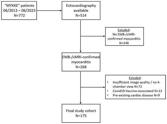 The “MYKKE” Registry is a multicenter, prospective, long-term registry for suspected pediatric myocarditis that provides a research platform for clinical trials investigating the epidemiology, clinical entity, diagnostic and therapeutic approaches, and outcomes of pediatric myocarditis. The registry is hosted and technically managed by the Competence Network for Congenital Heart Defects. Ethical approval was first obtained at the initiating center (Deutsches Herzzentrum Berlin, Berlin, Germany) by the Ethics Committee of Charité—Universitätsmedizin Berlin (EA2/074/13) and subsequently confirmed by the local authorities of all collaborating centers (ClinicalTrials.gov Identifier: NCT02590341) according to the Declaration of Helsinki. Since 2013, 30 medical centers in Germany, Switzerland, and Austria have become participating partners. Within the “MYKKE” registry, we designed a sub-study performing retrospective echocardiographic strain analysis at initial admission in children with confirmed myocarditis to evaluate its diagnostic and prognostic value.