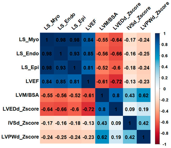 Figure 2. Correlation plot with a selected set of echocardiographic indices. The correlation coefficient r is presented. Values above 0.5 were considered to indicate a moderate correlation, while values greater than 0.7 were regarded as indicating a high correlation. Strain measures were based on absolute numbers. BSA—body surface area; IVSd—interventricular septal thickness at end-diastole; LS—longitudinal strain; LVEDd—left ventricular end-diastolic diameter; LVEF—left ventricular ejection fraction; LVM—left ventricular mass; LVPWd—left ventricular posterior wall thickness at end-diastole.