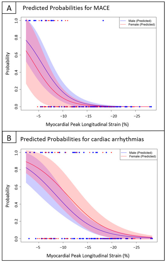 Figure 3. Predicted probabilities of major adverse cardiac events (MACE) (A) and cardiac arrhythmias (B) are shown as a function of mean myocardial peak longitudinal strain by sex for the median cohort age (14.9 years), based on the adjusted regression models (see Table 4 and Table 5).