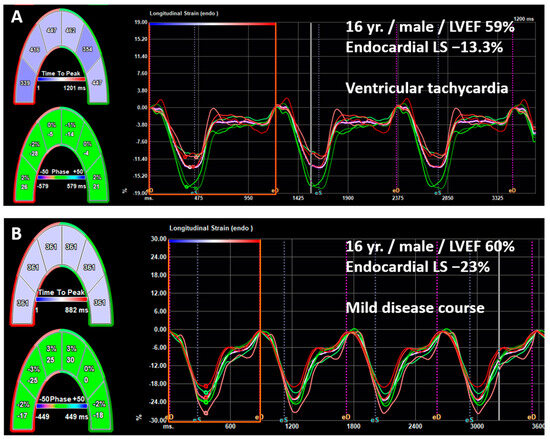 Figure 4. Exemplary measurements of endocardial longitudinal strain (LS) in two 16-year-old male patients, both with normal LVEF. The patient experiencing ventricular tachycardia (A) shows a significant decrease in endocardial LS compared with the patient without the occurrence of cardiac arrhythmias (B).