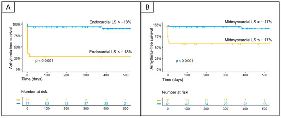 Figure 5. Kaplan–Meier analyses for the occurrence of cardiac arrhythmias according to the endocardial left ventricular longitudinal strain (LV LS) (A) and midmyocardial LV LS (B). The cutoff values were determined based on regression models and calculated using receiver operating characteristic (ROC) analyses and Youden’s J index.