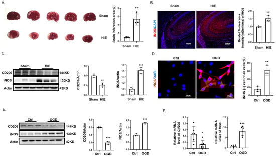To determine whether microglia undergo polarization and to identify the type of microglia polarization in HIE, we established an HIE model in 7-day-old SD rat pups, with sham-operated pups as the control group. Compared to the sham group, TTC staining demonstrated a pronounced infarct on the left hemisphere of the brain in the HIE group (Figure 1A). Immunofluorescence detection showed a significant increase in the M1 microglia marker iNOS in the HIE group compared to the sham group (Figure 1B). Western blotting assessments confirmed a significant increase in iNOS and a decrease in CD206, the M2 microglia marker, in HIE versus sham brain tissues (Figure 1C). In vitro, immunofluorescence analysis revealed a substantial elevation in iNOS (+) microglia in the OGD model (Figure 1D). qPCR and Western blotting analysis also indicated a significant increase in iNOS protein and mRNA expression levels and a significant decrease in CD206 protein and mRNA expression levels after OGD (Figure 1E,F).