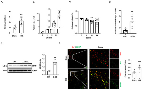 During OGD, cells underwent metabolic reprogramming to initiate anaerobic glycolysis [21]. Brain tissues from HIE neonatal rats exhibited significantly elevated lactate levels compared to their sham-operated counterparts, reflecting enhanced anaerobic glycolysis (Figure 2A). In BV2 microglial cells subjected to OGD, lactate accumulation increased progressively over time (Figure 2B). Concurrently, CCK8 demonstrated a decline in cell survival with extended OGD exposure (Figure 2C). Notably, after 24 h of OGD, Ldha mRNA expression in BV2 cells was significantly elevated compared with controls (Figure 2D). LDHA catalyzes the terminal step in lactate production during anaerobic glycolysis [22,23]. Western blotting analysis showed a significant upsurge in LDHA protein levels (Figure 2E), and immunofluorescence indicated a marked increase in LDHA in Iba1- positive microglia within the HIE animal model (Figure 2F). In summary, these findings from both the animal and cellular models suggest an upregulation of LDHA, facilitating increased lactate production by microglia.