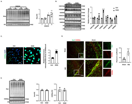 Total protein lactylation levels in BV2 cell gradually increased during OGD (Figure 3A). Analysis of histone lactylation sites showed a significant elevation in H3K9 lactylation (Figure 3B). Immunofluorescence staining of microglia (Iba1-positive) in both the BV2 OGD model and the SD rat HIE model demonstrated a marked increase in H3K9 lactylation (Figure 3C,D). However, the evaluation of total protein acetylation and H3K9 acetylation levels in BV2 cells during OGD revealed no significant changes (Figure 3E).