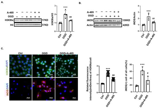 Previous studies have demonstrated that the histone acetyltransferase P300 mediates histone lactylation by transferring lactyl groups to lysine residues on histones [24,25]. At the beginning of the OGD, we added 50 μM P300 inhibitor, A-485 (MCE, HY-107455), for 24 h to significantly suppress OGD-induced H3K9 lactylation (Figure 4A). Immunofluorescence and Western blotting analyses showed that P300 inhibition reduced the expression of the cell marker iNOS in OGD-induced M1-type microglia (Figure 4B,C). These findings suggest that reducing H3K9 lactylation levels may attenuate M1 polarization in microglia.