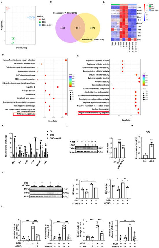 Histone lactylation regulates microglial polarization through the TNFα pathway. (A) PCA plot of genes from the control, OGD, and OGD + A-485 groups. (B) Venn diagram of genes upregulated in the OGD group compared to the control group and downregulated in the OGD + A-485 group compared to the OGD group. (C) M1 microglia-specific genes among the control, OGD, and OGD + A-485 groups. (D) KEGG enrichment analysis of intersecting genes from the Venn diagram. (E) GO enrichment analysis of intersecting genes from the Venn diagram. (F) Western blotting analysis of TNFα levels in the control, OGD, and OGD + A-485 groups (n = 4). (G) Changes in inflammatory factors among the control, OGD, and OGD + A-485 groups (n = 4). *, **, ***, OGD vs. Ctrl; #, ##, ###, OGD + A-485 vs. OGD. (H) ChIP-qPCR analysis of H3K9 lactylation enrichment in the Tnfα DNA fragment (n = 3). (I) Changes in M1 microglial polarization among the control, siTNFα, OGD, and OGD + siTNFα groups (n = 3). (J) Changes in inflammatory factors among the control, siTNFα, OGD, and OGD + siTNFα groups (n = 3). Significance: * p < 0.05, ** p < 0.01, *** p < 0.001; # p < 0.05, ## p < 0.01, ### p < 0.001.