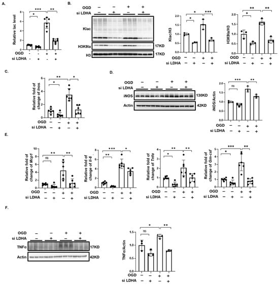 Histone lactylation uses lactate, a product of anaerobic glycolysis, as a substrate [24,27]. Since P300 modifies both lactylation and acetylation, we used siRNA to knock down LDHA, significantly reducing lactate secretion in BV2 cells after OGD (Figure 6A). LDHA knockdown also markedly decreased total protein lactylation and H3K9 lactylation levels induced by OGD (Figure 6B). Additionally, the expression of M1 microglial marker and various inflammatory factors significantly decreased following LDHA knockdown (Figure 6C–E). The increase in TNFα expression mediated by OGD was also inhibited by the knockdown of LDHA (Figure 6F).