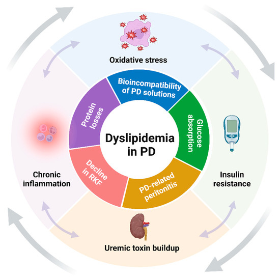 Dyslipidemia is a common finding in patients with CKD that can develop in the early stages of the disease and becomes particularly pronounced in patients with kidney failure [9,47]. Data from the National Health and Nutrition Examination Survey (NHANES) between 2001 and 2010 highlighted this progression, with dyslipidemia prevalence increasing from 45.5% in CKD stage 1 to 67.8% in stage 4 [48]. Although the mechanisms responsible for CKD-associated dyslipidemia are still not fully understood, the interplay of factors such as uremia-induced oxidative stress, inflammation, and insulin resistance is believed to be the primary drivers of these changes, often manifesting before the initiation of PD [9,49,50].