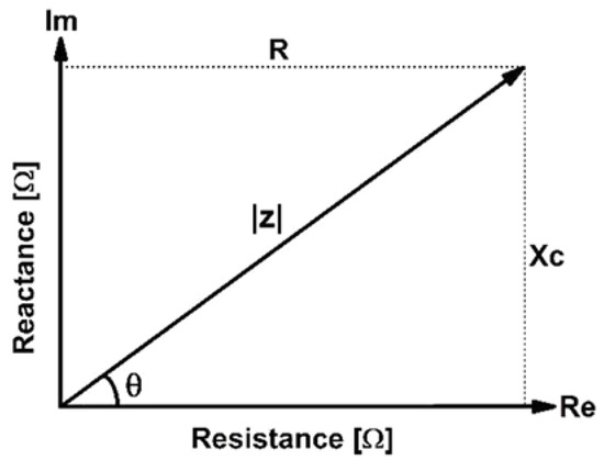 Figure 1. Diagram illustrating the concept of a complex impedance. Z is impedance, |Z| is the magnitude of impedance, R is the resistance, Xc is the reactance, and θ is PA.