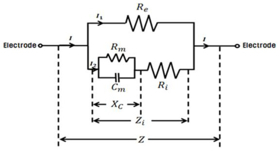 Figure 2. Equivalent circuit consisting of Re (ECW), cell membrane (Cm), and Ri (ICW). Here, XC is the reactance of the cell membrane, Zi is the impedance of XC and Ri, and Z is the impedance of Zi and Re.