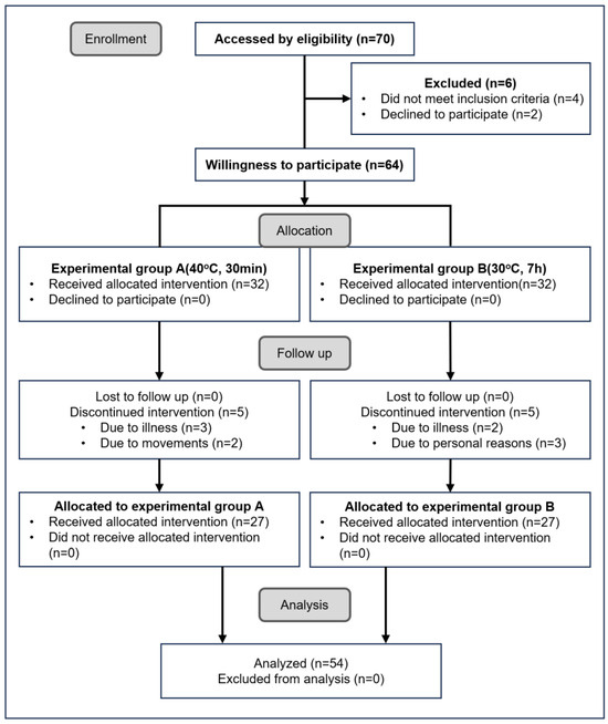 This experimental protocol was approved by the Inje University Bioethics Committee (registration number: INJE 2023-05-035-005) dated 20 September 2023, under the clinical trial registration titled “Improvement of blood circulation and health promotion effects in related diseases by FIR emitted from loess bio-balls”. This experiment was mainly conducted based on the Consolidated Standard of Reporting Trials (CONSORT), as shown in Figure 3, at Hanwool Bio’s Research and Development Center, and included self-reported home measurements from study participants. The exclusion or discontinuation criteria for the intervention were as follows: pregnant women or applicants with cancer, diabetes, cardiovascular, or neurological diseases. Participants who showed symptoms of mental weakness or anxiety, or who withdrew from participation due to illness or personal reasons were also excluded from the intervention. Of the 70 participants, 6 were excluded because they did not meet the inclusion criteria (n = 4) or withdrew from the study for personal reasons (n = 2). After hearing an explanation of each experiment, 64 participants expressed their willingness to participate in each experiment, taking into account their personal circumstances. The participants freely chose experimental group A or experimental group B, and 32 subjects were assigned to each group. During the follow-up experiment, 10 additional subjects were excluded due to illness or personal reasons: five from group A and five from group B. The total number of experimental subjects who participated in the experiment was 54, and they were divided into group A (n = 27) and group B (n = 27) and participated in each experiment.