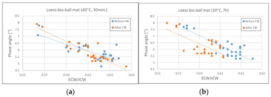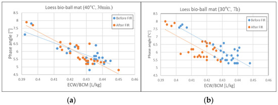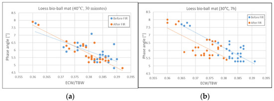 Figure 6. Relationship between PA and ECW/BCM before and after FIR from loess bio-ball mat: (a) before and after 30 min of exposure to FIR on a loess bio-ball mat set at 40 °C; (b) before and after 7 h of exposure to FIR on a loess bio-ball mat set at 30 °C. Circles (blue, orange) represent measured values for 27 participants, and dotted lines (blue, orange) represent estimated lines.